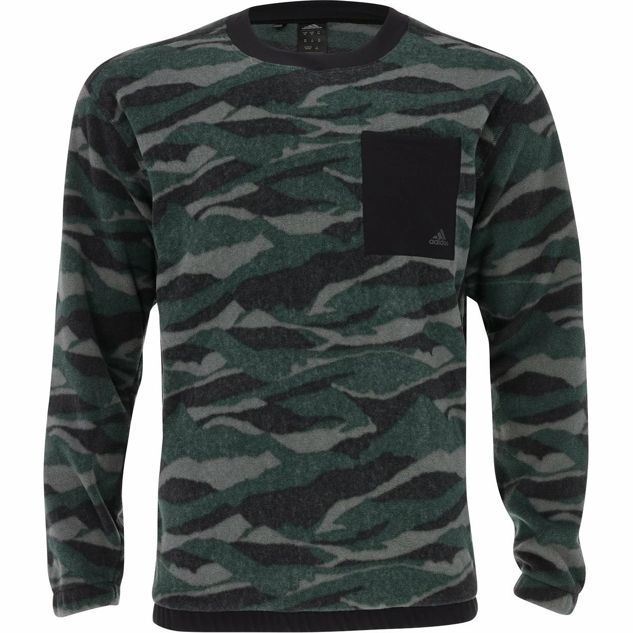 The Adidas Texture Print Crewneck features a regular fit, lightweight fabric, patch pocket on chest hem, elastic cuffs and hem, drawcord on hem, front and back graphics, and water repellent coating