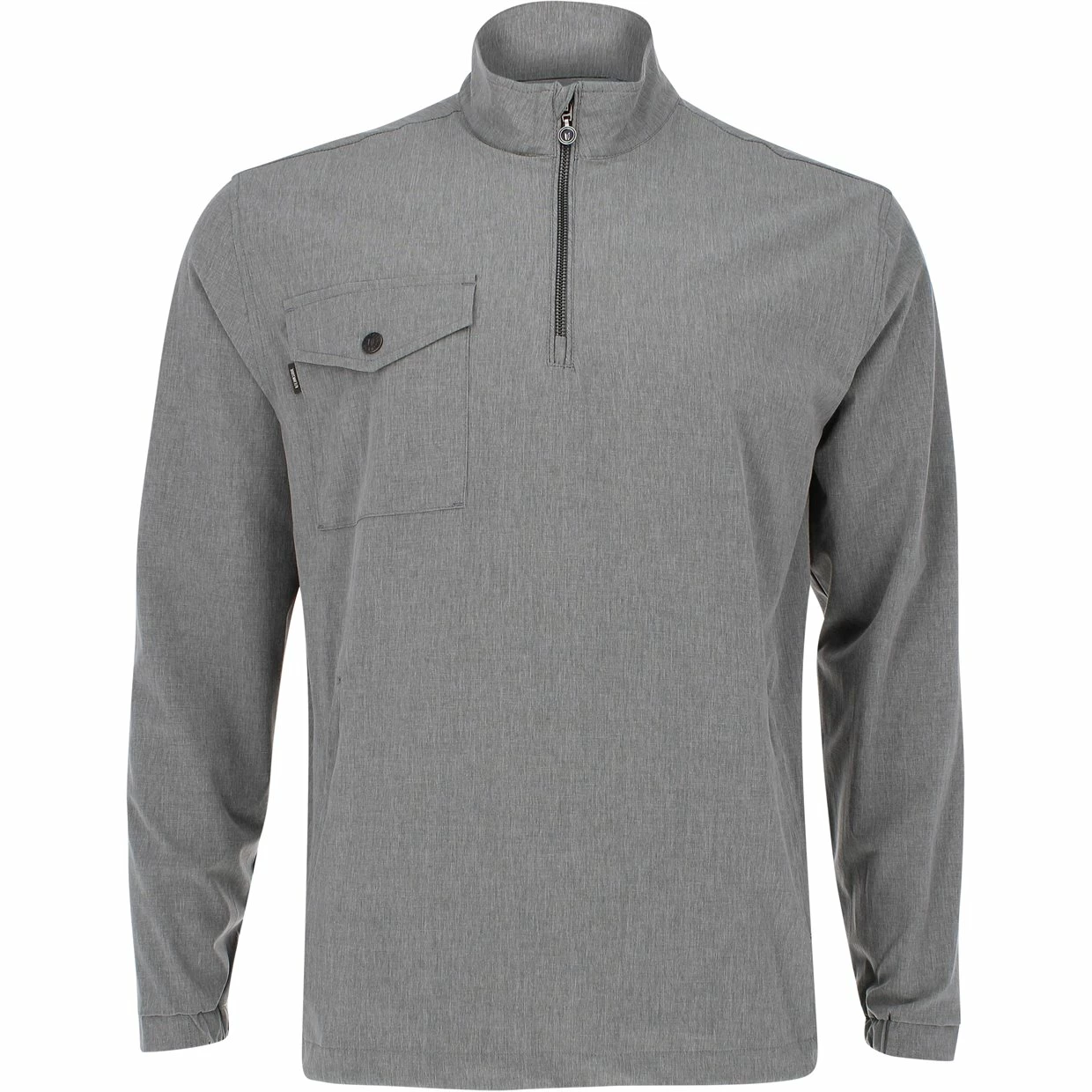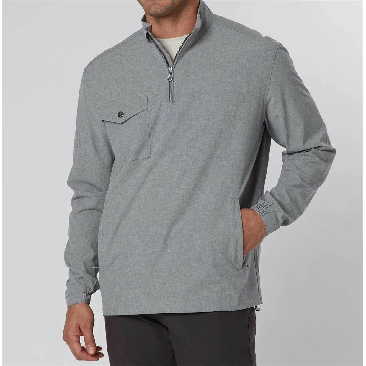 - Buttoned chest pocket/ Half zip closure/ Raised collar/ Front zip pockets/ Bungee cord at waist