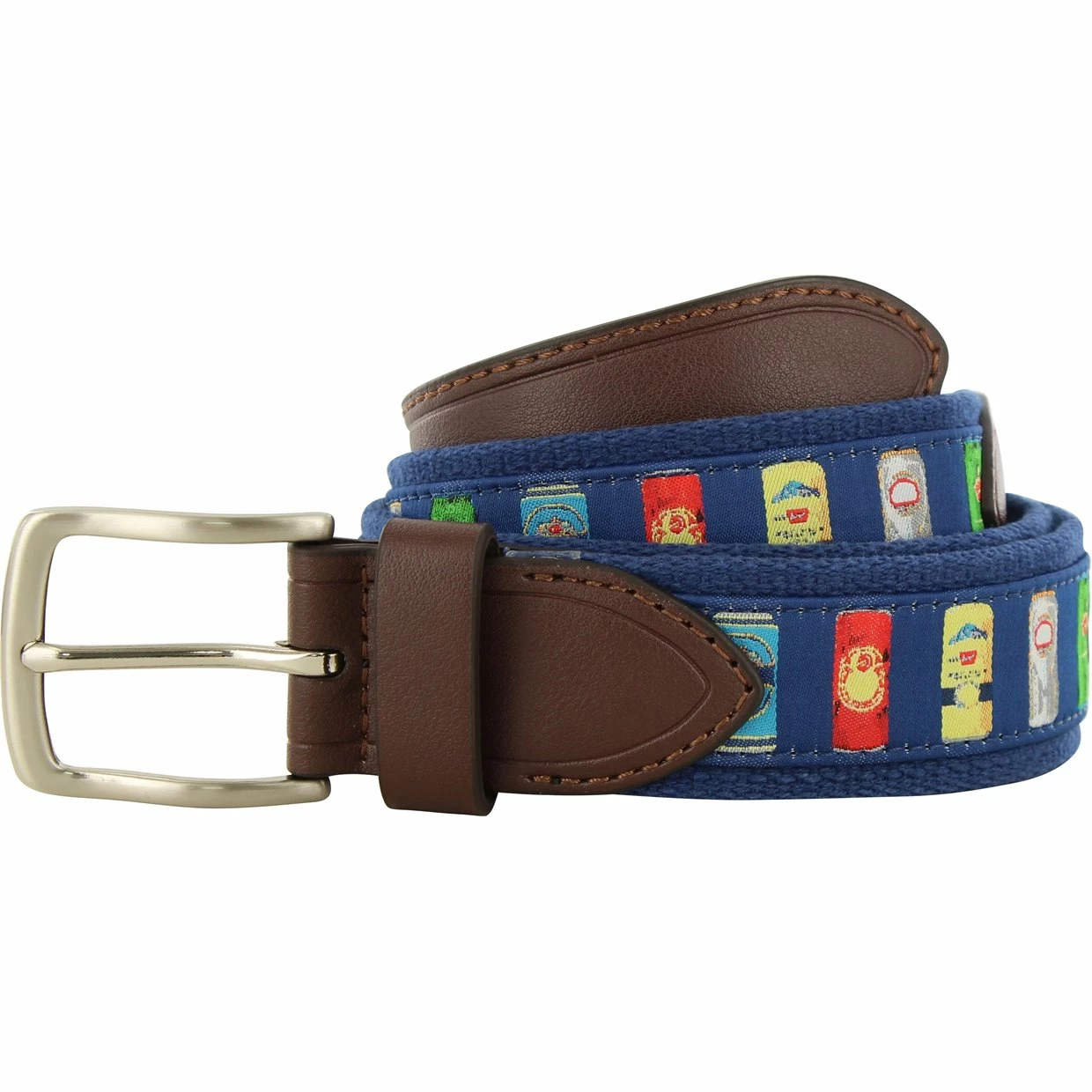 The Pebble Beach Beer Can ribbon belt features a ribbon overlay with genuine leather tabs and a sliver finish buckle. 7 point end holes allow for a “Better Fit”