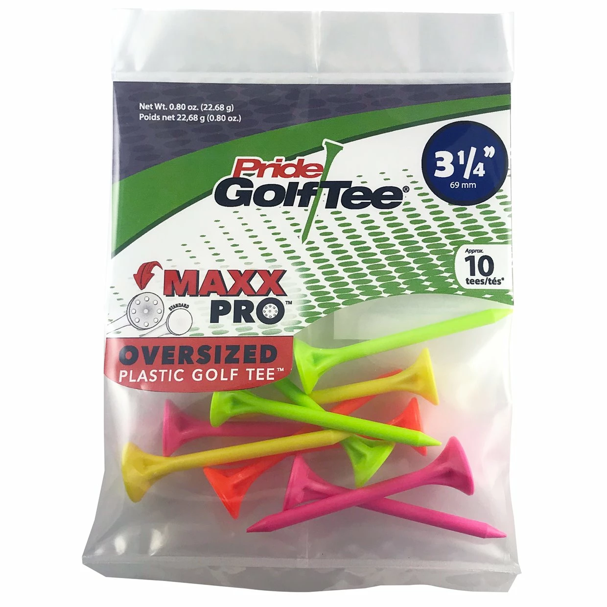 The Pride Sports MaxxPro Oversized golf tees are engineered with a larger head to allow easier placement of the golf ball. The durable plastic golf tee has built in dimples to make sure the golf ball sits high on the tee for consistent drive distances.
