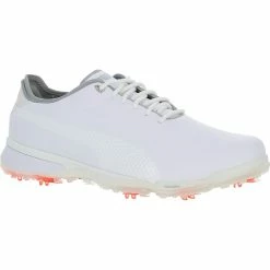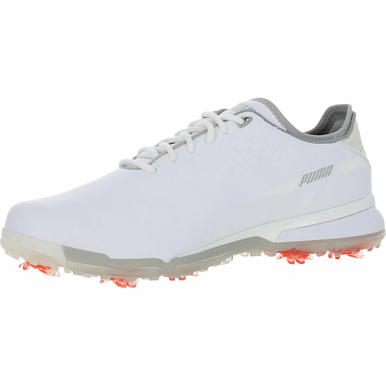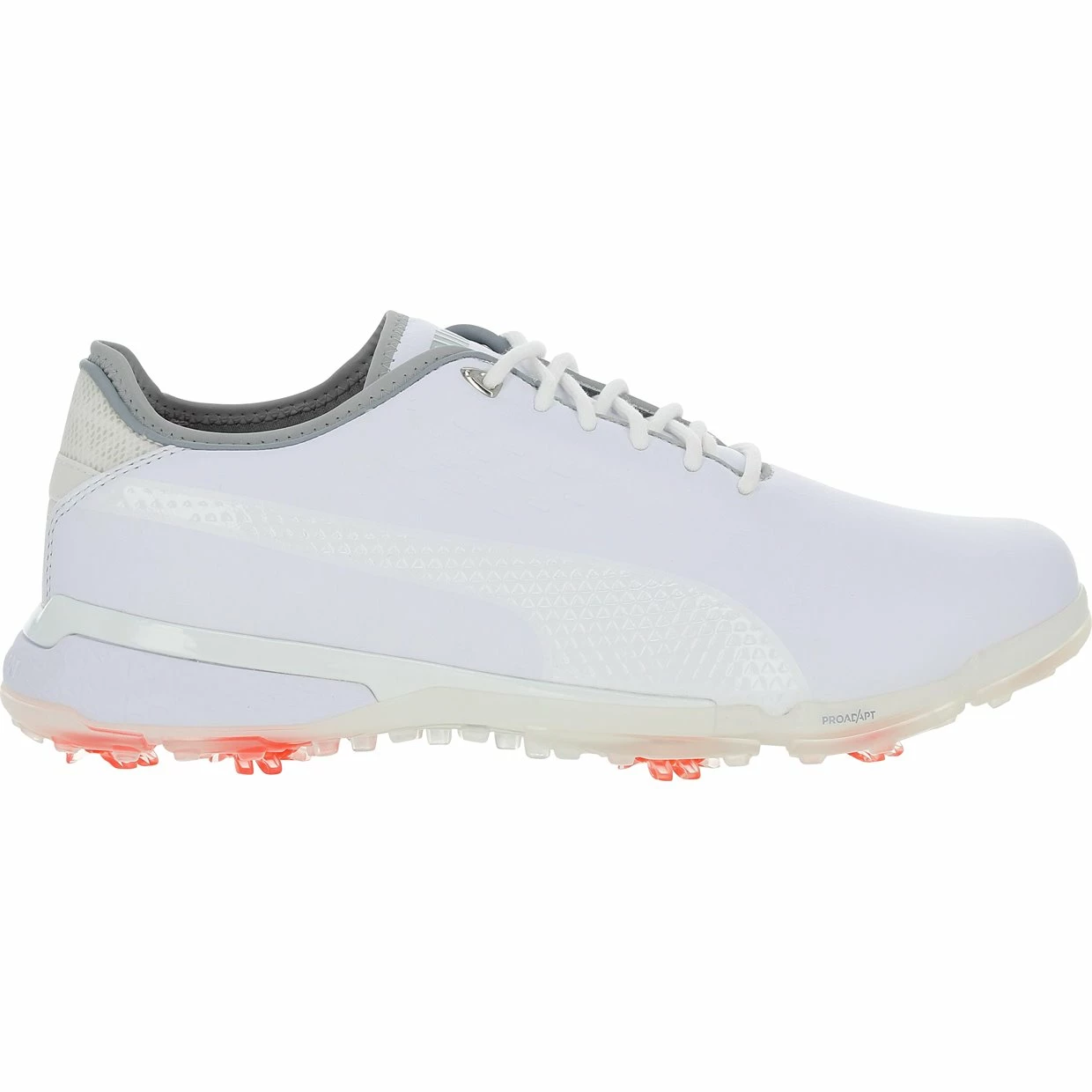The Puma ProAdapt golf shoe features a full grain Atlantis leather upper that provides durability and waterproof protection with a 1 year warranty. The upper features an Adaptive Fit System that offers dual layer collar construction for extreme comfort. The inner shoe features an Adapt-Wrap Tongue that wraps around the instep to offer medial support. The AdaptFoam midsole provides stable cushioning, excellent dimensional stability, high energy return and ground feel. Features of the outsole include Dual-durometer tornado cleats for excellent gripping power throughout your swing and a ProAdapt full length TPU sole. The sole is constructed with flex-groves in key areas that provide next level traction and support, improved natural movement and unrivaled comfort for walking the course.